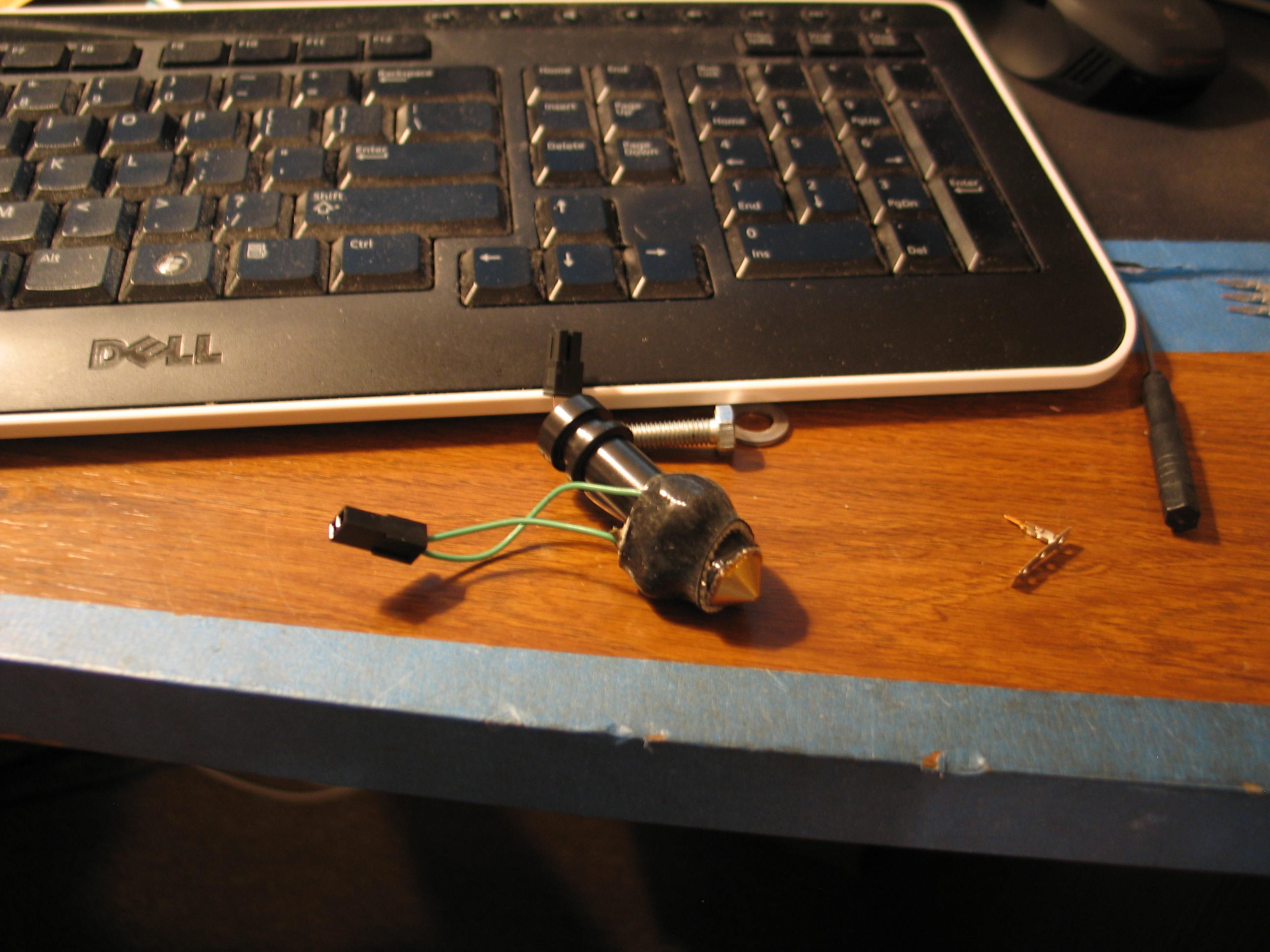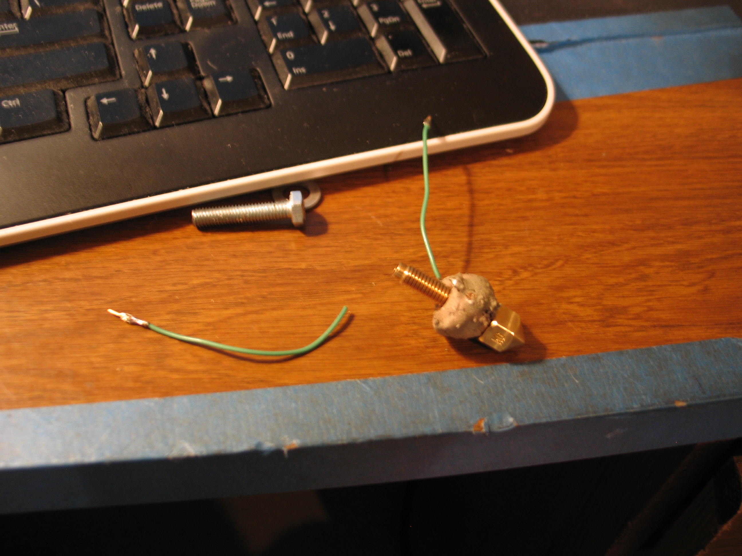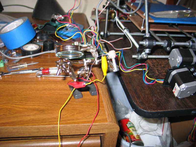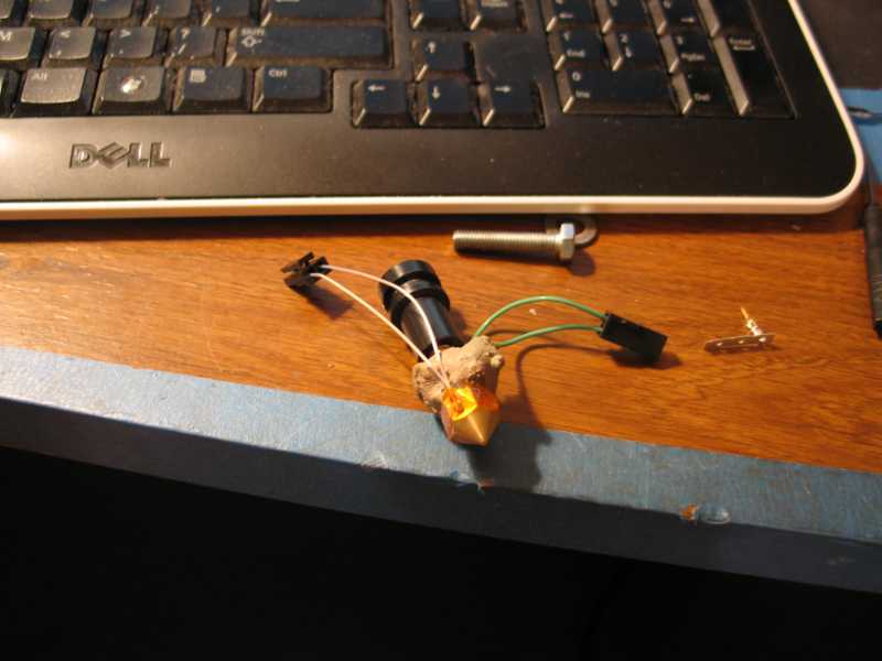 Then I did the other direction the same way. That was too easy! I must have screwed something up. I think the platform has to be leveled more precisely when you start printing. If you look at the RAMPS board in the photo above, you can see the Z axis motor plug is at an angle. I used wire I had on hand to go from that plug to the terminal block where the wires split for the 2 motors. The wire is too heavy. It's stiff and causes it to pull the plug. I need to replace it when I tidy up the wiring. Anyway, this brings us to the end of the Prusa Mendel Visual build instructions. Don't worry, we are still a long way from our first good print! I dug out the hot end kit from Makergear. Following the instructions on their site I wound the Nichrome wire around their brass guide and slathered on the ceramic paste (fireclay?) and wired it up to 12 volts from the power supply and cooked it. After applying the second coat of clay, I thought I was home free when one of the wires broke off! I thought I would have to trash it and start over, but I was able to chip away enough clay to solder the wire around the crimp connector. Only time will tell if it will hold. The kit comes with enough extras to make two of these ceramic cores. I spread some more clay and fired it again. It seems OK. The next problem was my fault. I soldered the little pins for the Molex plug on the green wires. This made them too large to go in the housing. I had to cut them off an crimp on some spares from the kit. I also had to look up the connectors by the numbers on the tiny housings to get the data sheets for assembly details. I sure didn't want to screw these up! ![]() Here it is with the insulation in place. This was tricky until I stretched it over my fingers to loosen and warm it up. ![]() My