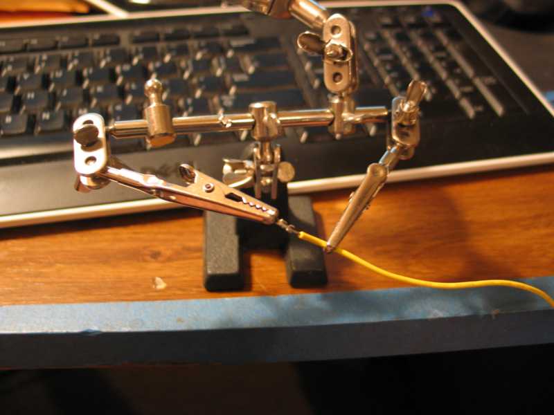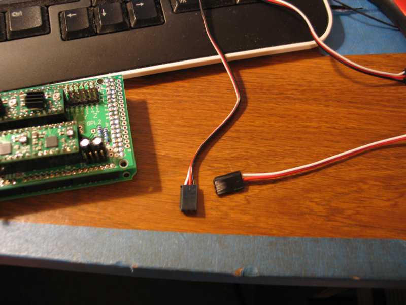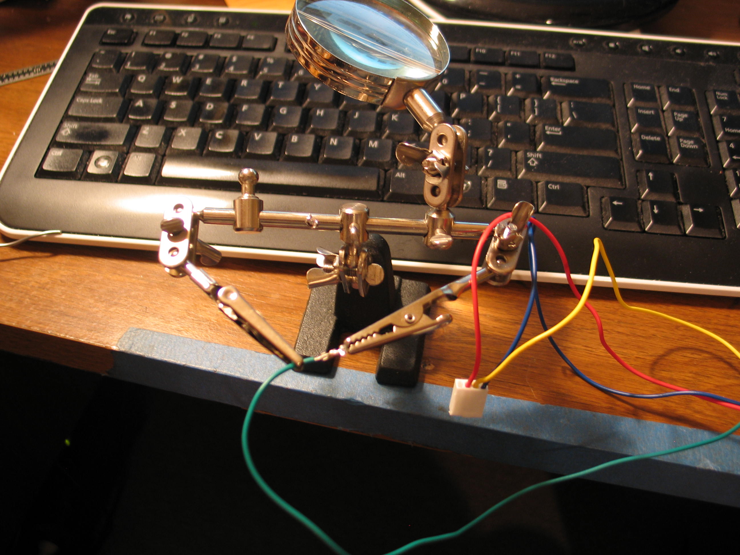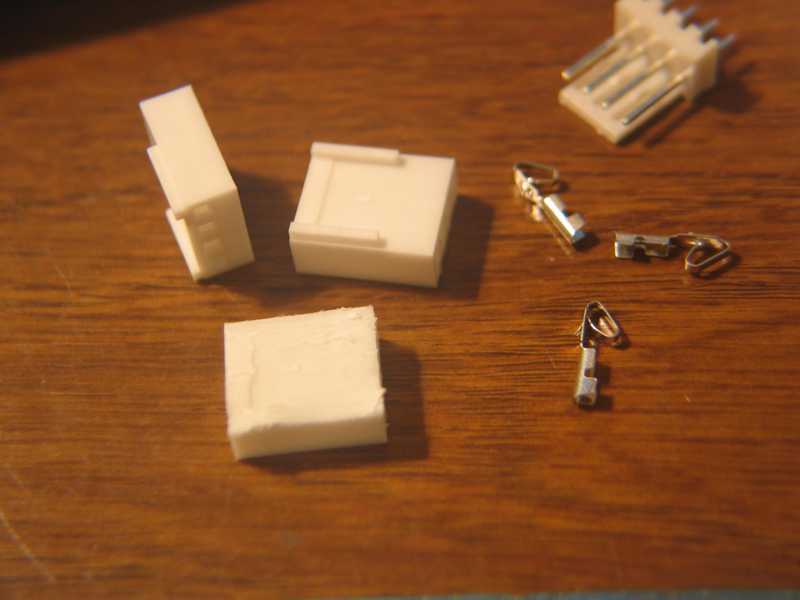 If it turns out to be too short, I can just add an extension! ![]() The left one is uncut, the right has the black wire removed. Damned shadow looks like the wire. ![]() I had these 4 wire connectors as well. Just right for the motors except for the pesky shoulders that get in the way. ![]() It's hard to see, but the housing is held firmly in a Panavise jr. You could also use a hobby knife or a soldering iron. ![]() I