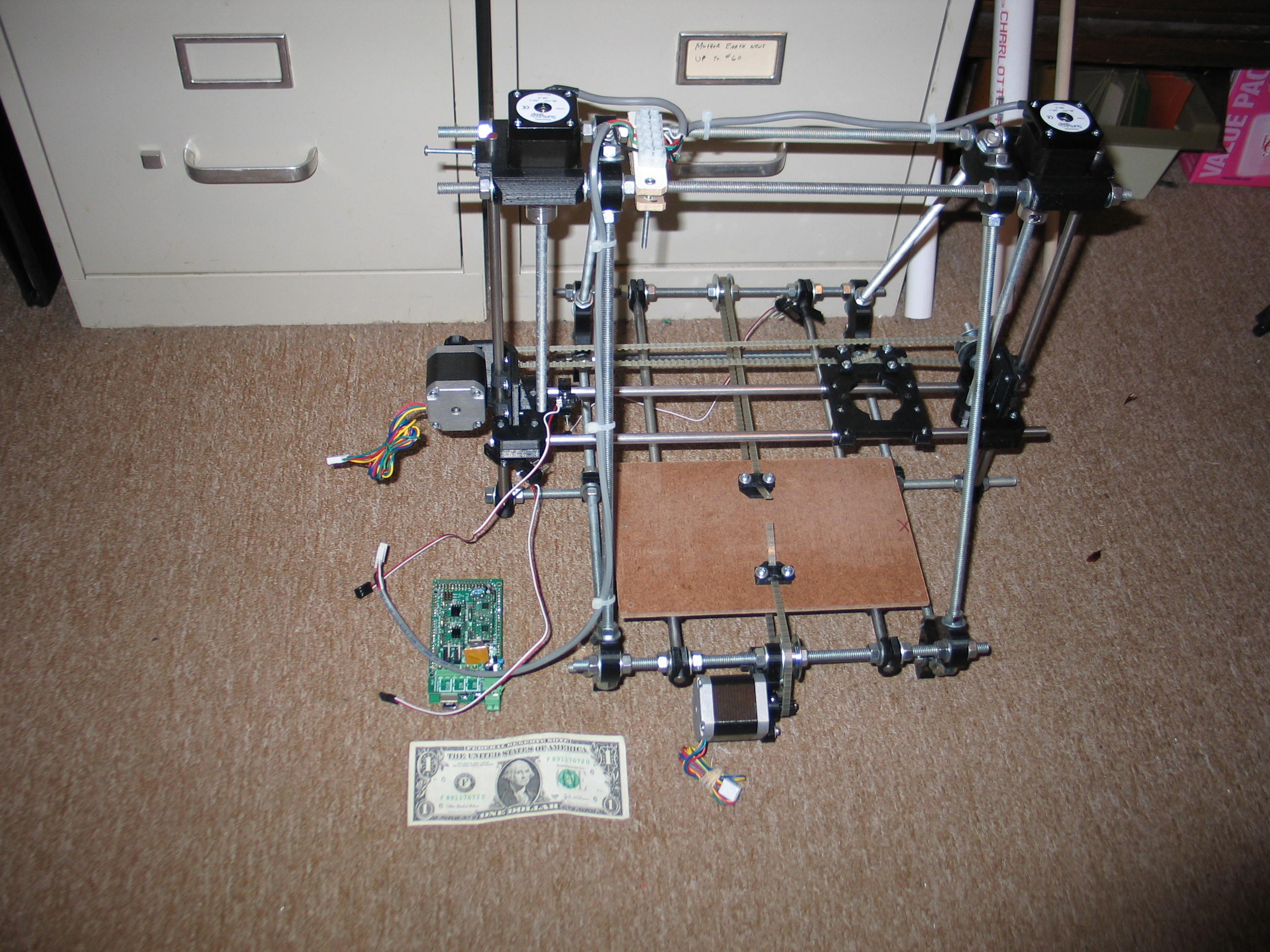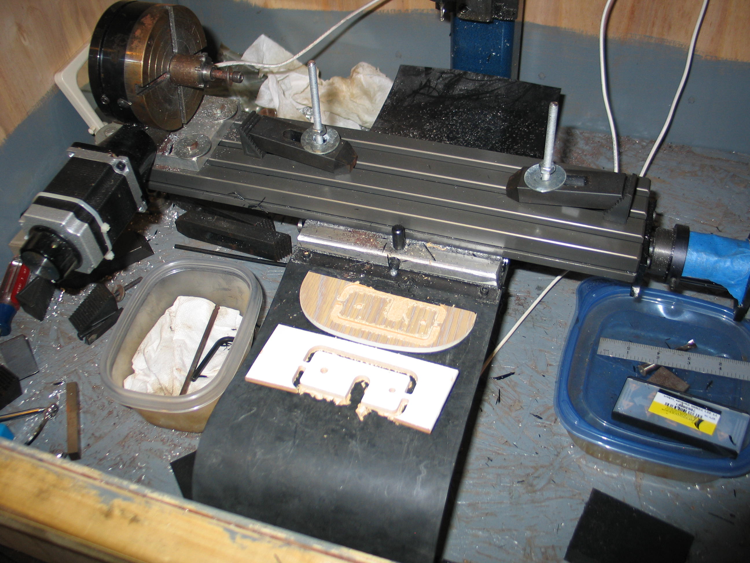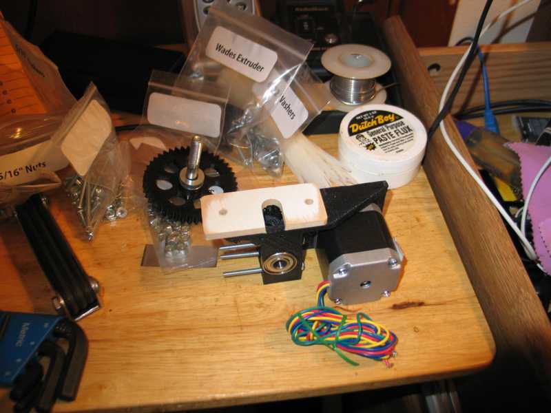 | Click here to learn how to be notified when this site changes. Just a little more on the extruder before we move along to wiring. I noticed the extruder didn't seem to fit the X carriage very well. The large gear was in contact with it. After some questions back to Lulzbot, I found out there is a part not shown in the visual instructions. There is a spacer. actually a mount for the hot end. I contacted Makergear, as I ordered their hot end, and they sent me a dxf of the profile and said it was made from 1/4" plywood that actually measured about 4.7MM. I looked around and found some fan blades from a ceiling fan. They were the right thickness and were made of hardboard (Masonite). ![]() This is how a machinist does wood working.<GRIN>