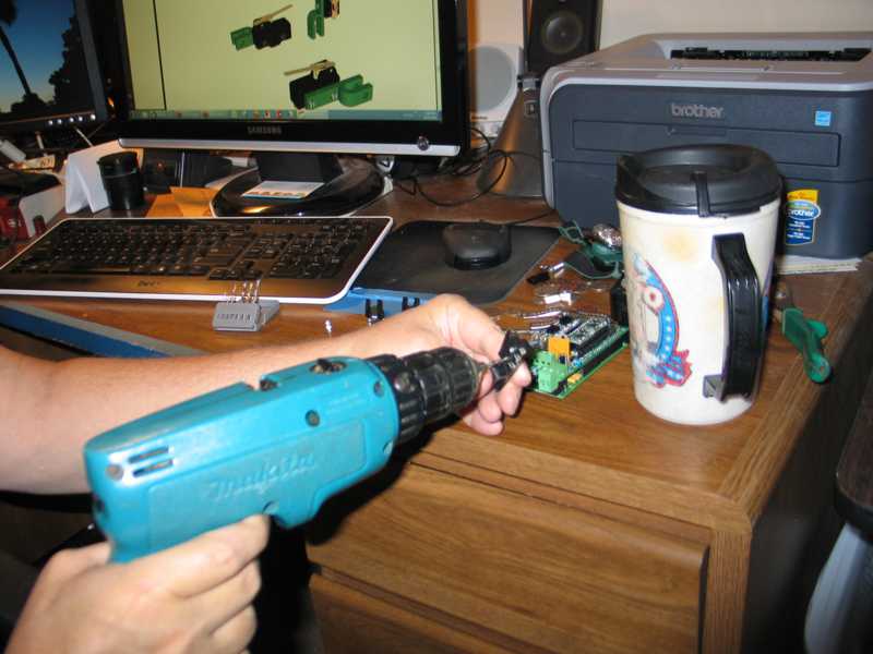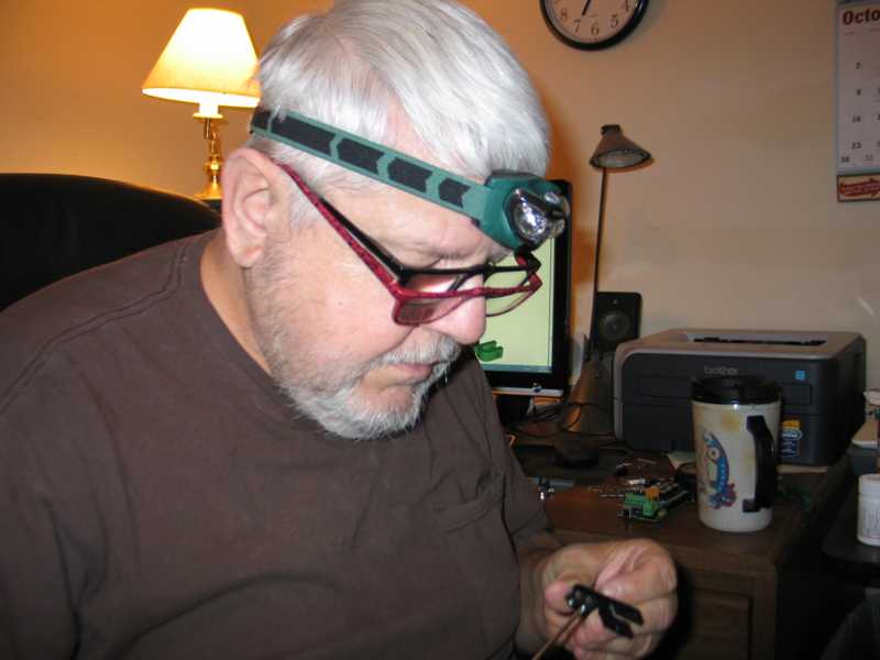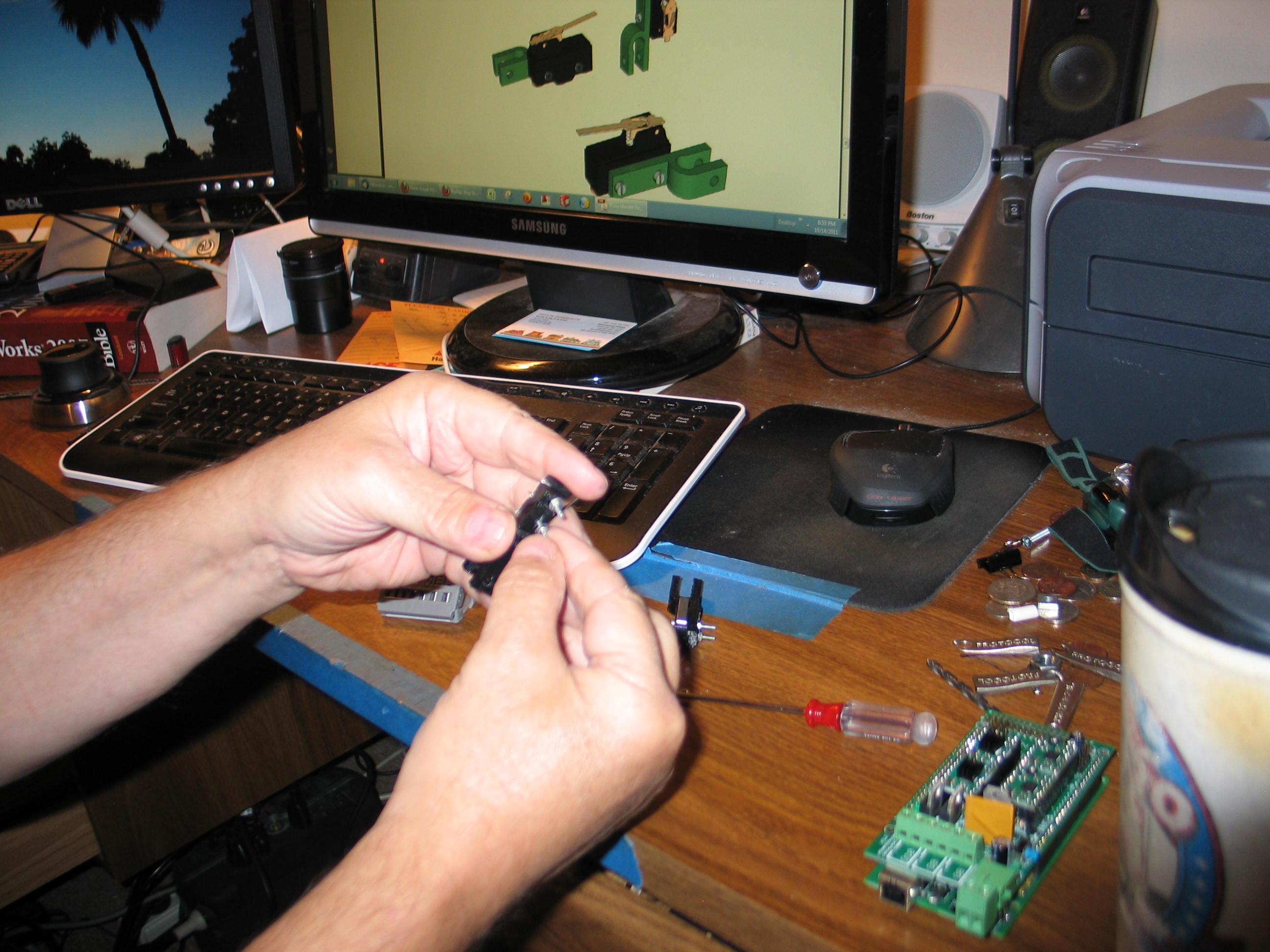 The switch mounting holes are small and don't match the spacing of the printed mount. I bought 2MM hardware to mount them. I put the end bolt in and then drilled the other one. A very easy operation, just watch those fingers! You've heard of a belt and suspenders, but have you ever seen two pairs of reading glasses? When your done laughing, try it. The LED headlight is pretty handy, as well. It's so bright, I had to turn it off for the photo. And the test fit looks good. Deciding where the electronics should live. For the wires to the switches, I chose to use parts from the Radio Control world. These are 3 wire extensions for airplane servos. I linked to these as an example, they come in different lengths. Again, I had these on hand. ![]() I