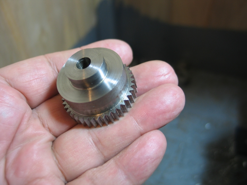 the cutting operation went splendidly. My setup was to cut .010" per pass at 6 inches per minute. The HSS cutter looks as good after 7 or 8 parts as it did when I first ground it. The cutter body helps conduct heat away from the tool, and it didn't even get warm even though I was cutting dry. This part is made from 12L14 steel. Given the size of the teeth, I think if I make another cutter, it will be smaller and instead of 3/8" tool steel, I will use 3/16". |